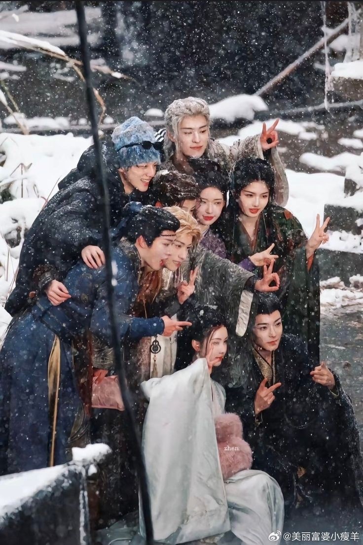 Группа людей в костюмах позирует для фотографии на фоне снежного пейзажа.