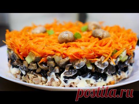 На изображении показан многослойный салат с грибами, морковью, и другими слоями овощей и мяса, заправленный майонезом.