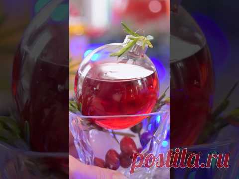 На изображении стеклянный шар с красной жидкостью, похожий на новогоднюю ёлочную игрушку, украшенный веточками розмарина и расположенный в бокале. Фон освещен праздничными огнями.