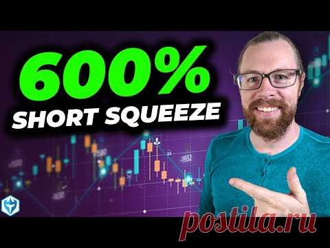 Изображение с человеком, который улыбается и указывает на текст "600% Short Squeeze". На заднем фоне виден график финансовых данных.