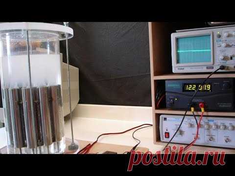 Изображение показывает лабораторную установку с различным оборудованием: цилиндрический резервуар, осциллограф и другие измерительные приборы.
