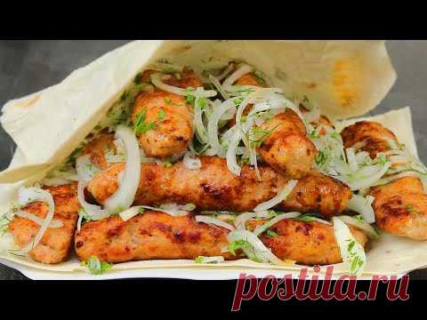 Изображение шашлычного блюда из мясного фарша, завернутого в лаваш и украшенного луком и зеленью.