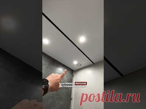 На изображении показан натяжной потолок с встроенным карнизом и установкой точечных светильников. Человек указывает на потолок.