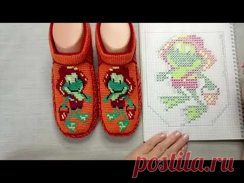 На изображении показана пара вязанных тапочек с изображением зеленой черепахи в красной одежде. Рядом лежит рисунок или схема с тем же изображением черепахи.
