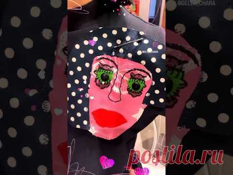 Эта картина изображает лицо с большими зелеными глазами и ярко-красными губами на черном фоне в горошек.