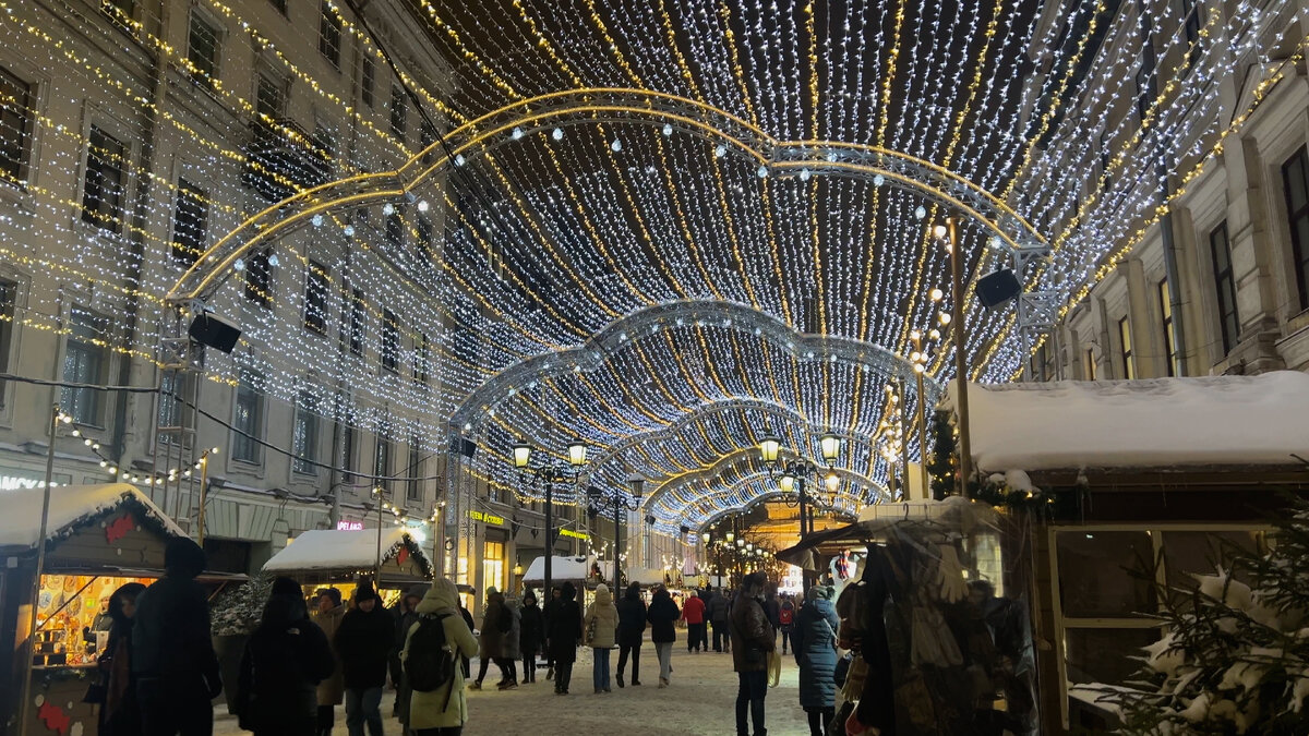 Улица украшена светящимися гирляндами, создающими праздничную атмосферу. Люди гуляют по улице, рассматривая украшенные палатки.