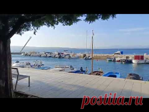 Изображение показывает небольшой порт с пришвартованными лодками на фоне спокойного моря. На переднем плане — теневая зона с деревом и скамейкой.