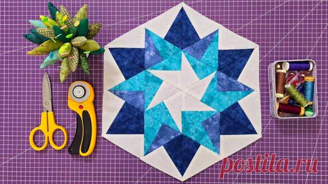 На изображении находится лоскутное шитье в виде звезды в оттенках синего и голубого. Рядом расположены инструменты для шитья: ножницы, роликовый резак и коробка с нитками. Также на изображении есть декоративное растение.