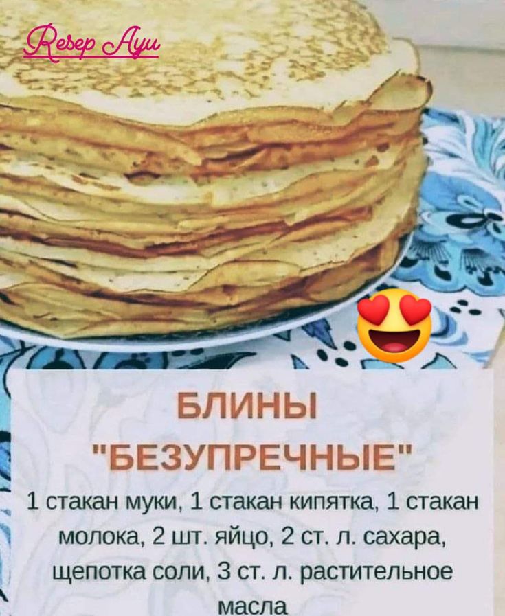 Изображение стопки блинов и рецепт под названием "Безупречные". В рецепте перечислены ингредиенты: 1 стакан муки, 1 стакан кипятка, 1 стакан молока, 2 яйца, 2 столовые ложки сахара, щепотка соли, 3 столовые ложки растительного масла.