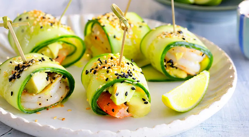 На изображении изображены закуски из огурца с креветками и авокадо, украшенные кунжутом и закрепленные шпажками. Напротив тарелки расположен ломтик лайма.
