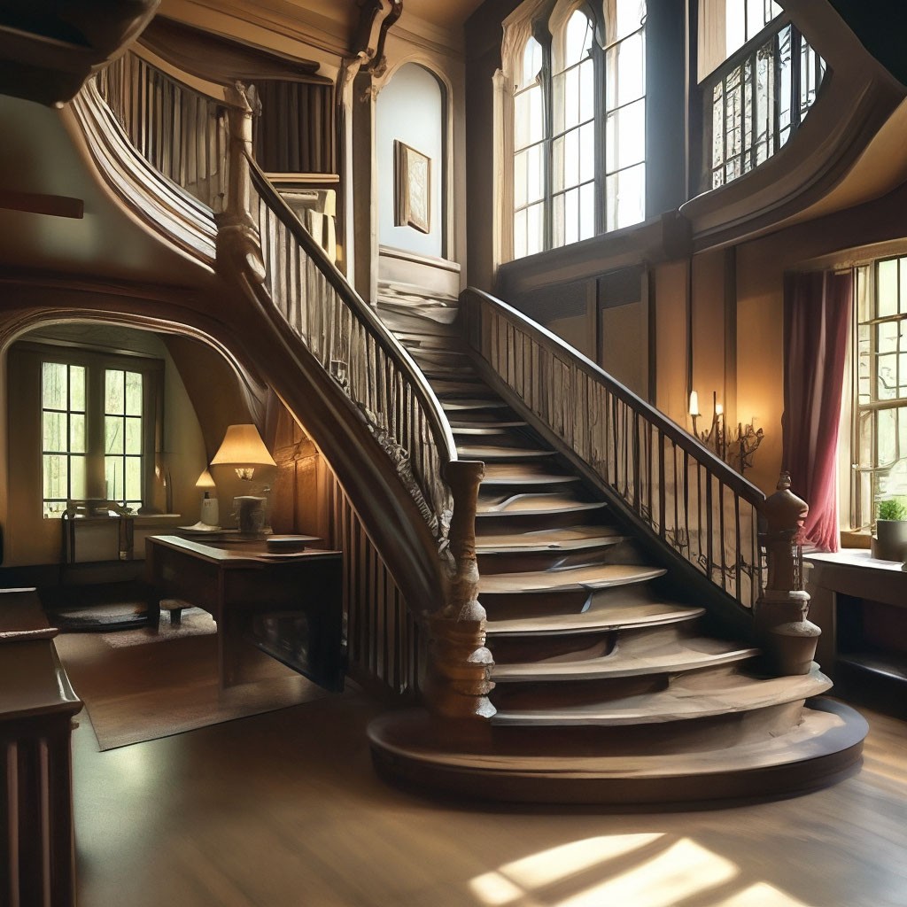 Изображение показывает элегантную деревянную лестницу в старинном интерьере с мягким освещением.