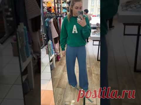 Человек в зелёной толстовке с буквой "A" и синих брюках стоит перед зеркалом в магазине.