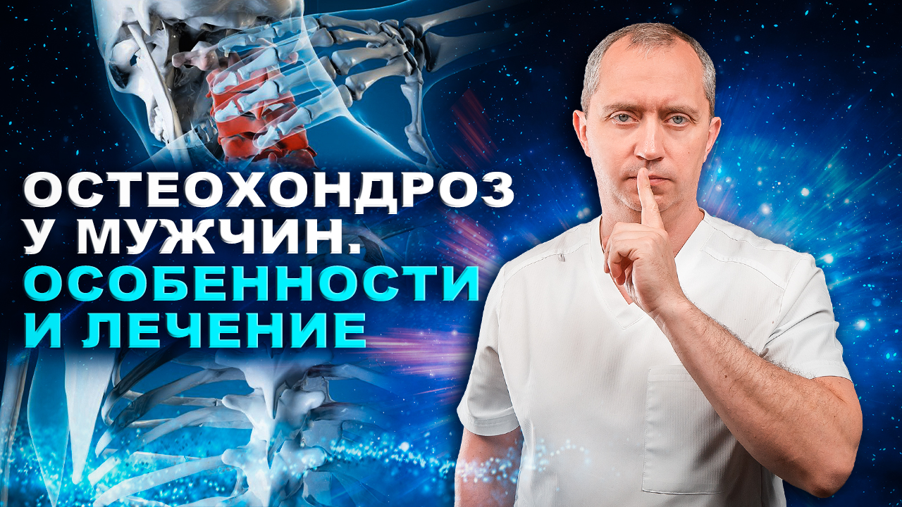 Изображение включает мужчину в медицинской одежде на фоне рентгеновского снимка позвоночника. Текст на картинке говорит о признаках и лечении остеохондроза у мужчин.