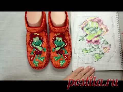 На изображении показана пара оранжевых тапочек с изображением персонажа в технике вышивки и схема вышивки этого персонажа на листе бумаги справа.