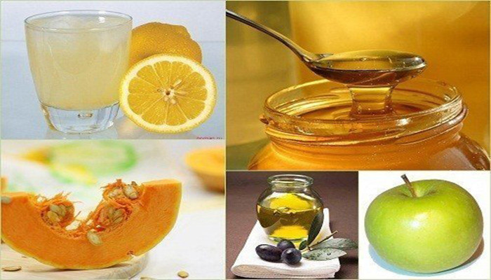 На изображении представлены различные продукты: стакан лимонного сока с лимоном, банка с медом и ложка, тыквенный кусок, баночка с настоем и зелёное яблоко.