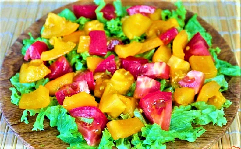 На изображении блюдо с зелёным салатом и кусочками разноцветных помидоров, поданных на тарелке.