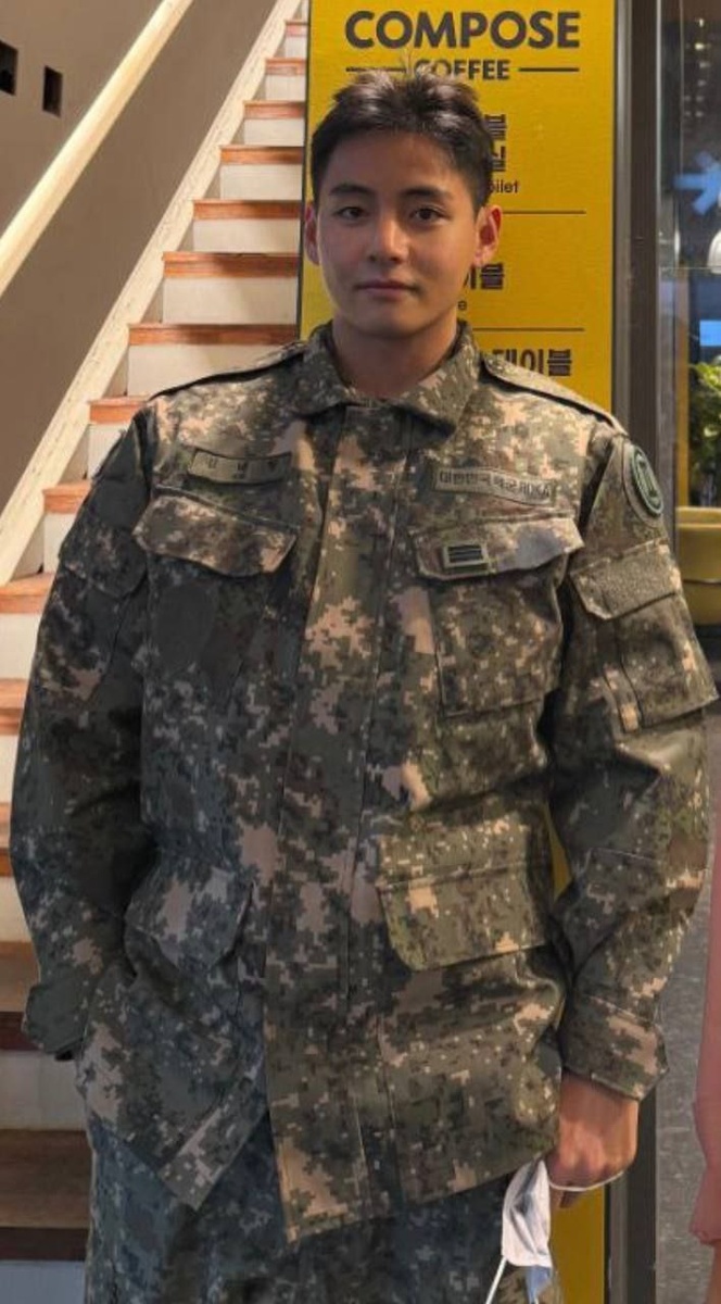 Человек в военной форме стоит на фоне лестницы и вывески.
