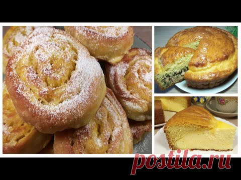На изображении представлены выпечка и пироги. Слева - булочки с сахарной пудрой, справа - пышный пирог с начинкой и кусок простого пирога.