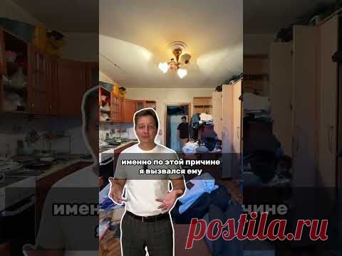 На изображении изображён мужчина, стоящий в комнате с беспорядком. Комната выглядит захламленной, рядом видно много одежды и вещей. На изображении наложен текст на русском языке.
