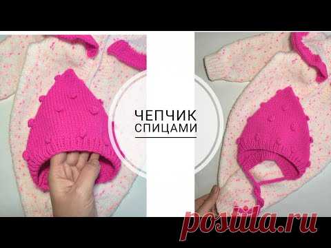 Изображение показывает вязаный детский чепчик и комбинезон. Чепчик яркого розового цвета с узорами, размещён на бело-розовом костюме для малышей.