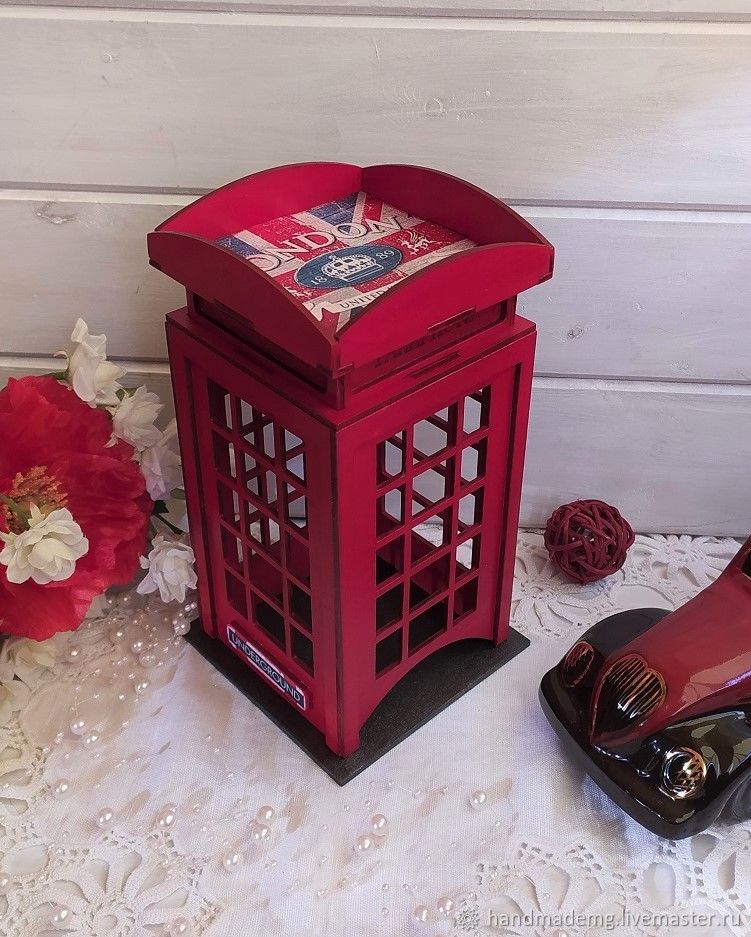 На изображении красная телефонная будка в виде шкатулки, украшенная флагом Великобритании. Рядом находятся декоративные цветы и фигурка автомобиля.