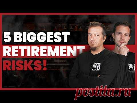 Изображение содержит текст "5 BIGGEST RETIREMENT RISKS!" рядом с двумя мужчинами на тёмном фоне.