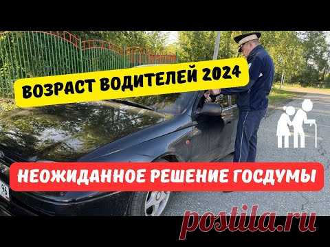 На изображении изображён сотрудник полиции, стоящий рядом с автомобилем. На картинке размещён текст: "ВОЗРАСТ ВОДИТЕЛЕЙ 2024" и "НЕОЖИДАННОЕ РЕШЕНИЕ ГОСДУМЫ".