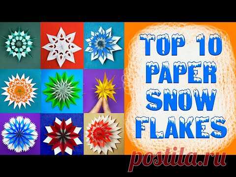 Изображение содержит девять различно оформленных бумажных снежинок и текст, гласящий "ТОП 10 БУМАЖНЫХ СНЕЖИНОК".
