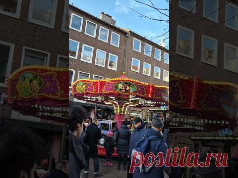 На изображении видно ярмарочную карусель с людьми, стоящими вокруг. На заднем плане виднеется кирпичное здание с окнами.