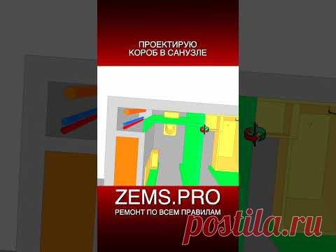 Изображение содержит текст и графическую схему. Текст гласит: "Проектирую короб в санузле. ZEMS.PRO ремонт по всем правилам". Графика представляет план помещения с различными цветами, вероятно, обозначающими разные элементы проекта.