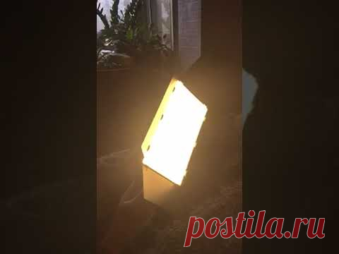 Изображение яркого светильника в темной комнате на фоне окна с растениями.