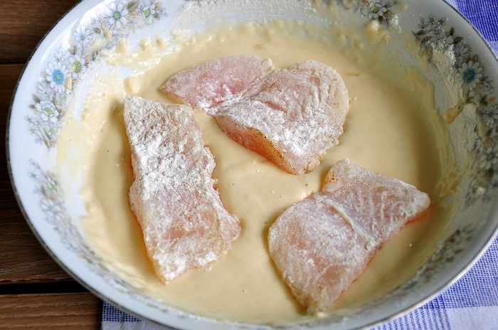Изображение показывает кусочки рыбы в тарелке с кляром, готовые для жарки.