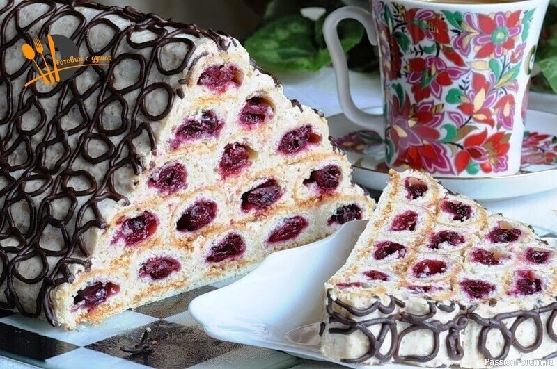 На изображении показан треугольный торт с вишнёвой начинкой и шоколадной глазурью. Рядом находится чашка с цветочным орнаментом.