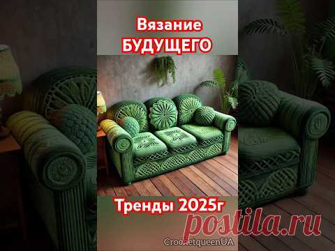 Изображение зелёного дивана, связанного крючком, в интерьере с растениями. Надпись на изображении гласит: "Вязание БУДУЩЕГО. Тренды 2025г".