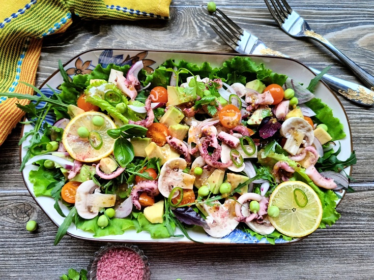 Салат с кальмаром, авокадо и свежими шампиньонами