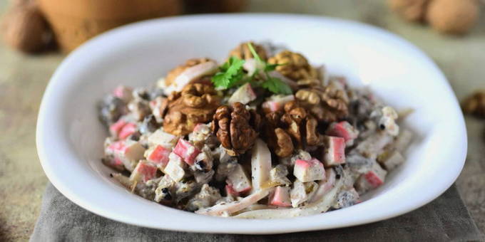 Салат с крабовыми палочками, грецкими орехами и зеленью, подается на белой тарелке.