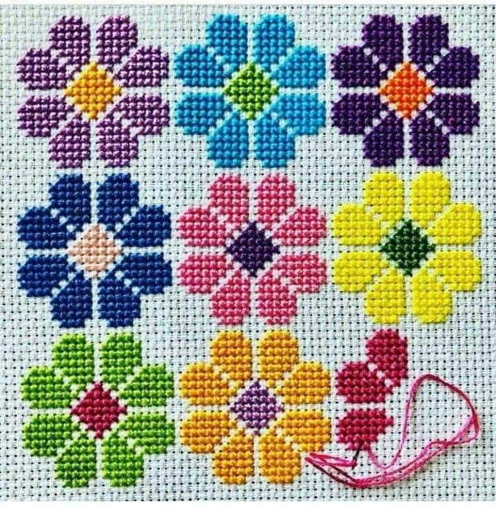 a cross stitch pattern with different colored flowers on the front and side, including one pink ribbon