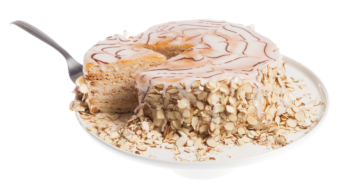 - 9 Абрикосовый конфитюр подогреть в сотейнике, чтобы он немного разжижился, протереть его через сито. Смазать конфитюром верхний корж. Обсыпать миндалем бока торта и отправить в холодильник на час.