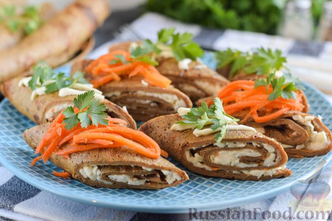 Рецепт: Блинные печёночные рулетики с плавленым сыром и чесноком на RussianFood.com