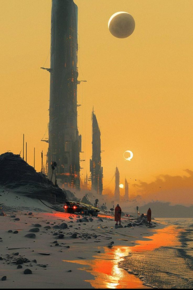 Рисунок. Фантастика. Пейзаж. Закат. Башни.