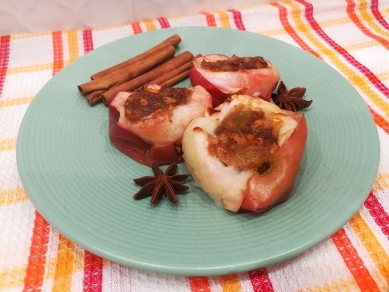 Печеные яблоки с банановым муссом и кедровым орехом Ингредиенты:Яблоки — 2 шт.Банан — 1 шт.Кедровый орех — 1 ст. л.Изюм — 1 стак.Апельсин (корка) — 1 шт.Корица (молотая) — 4 гКардамон (молотый) — 2 гПриготовление:1. Яблоки помыть, разрезать на половинки, вычистить у каждой половины сердцевину.2....