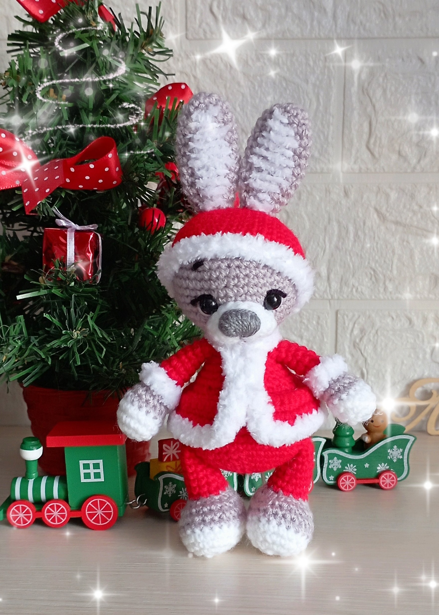 PDF Новогодний Зайка крючком. FREE crochet pattern; Аmigurumi toy patterns. Амигуруми схемы и описания на русском. Вязаные игрушки и поделки своими руками #amimore - зайка из обычной пряжи, заяц, зайчик в костюме Деда Мороза, кролик, зайчонок к Новому году, крольчонок.