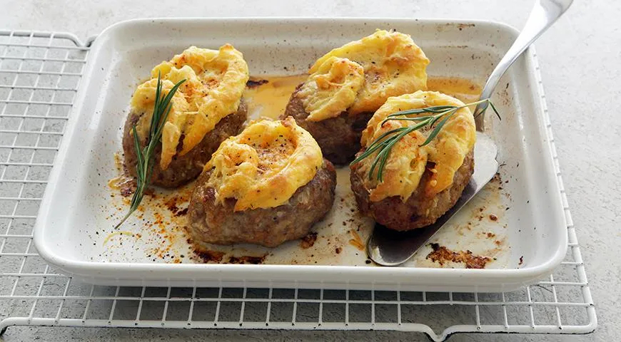 - РЕЦЕПТ ПРИГОТОВЛЕНИЯ Негаснущий экран Нажмите, чтобы экран не гас, пока вы готовите. Экран вернется в привычный режим, когда вы покинете страницу или отключите функцию Шаг 1 Нарежьте лук мелкими кубиками, измельчите чеснок. Соедините фарш с луком и чесноком, посолите, приправьте паприкой и черным перцем, добавьте 2 ст. л. холодной воды и тщательно перемешайте. Сформируйте овальные котлеты, разложите на тарелке, накройте пищевой пленкой и уберите в холодильник на 20 мин.Шаг 2 Очищенный картофель крупно нарежьте, сложите в кастрюлю, залейте горячей водой, посолите и доведите на сильном огне до кипения. Уменьшите нагрев до среднего и варите под крышкой 15 мин. Слейте отвар, картофель разомните в пюре и немного остудите. Добавьте тертый сыр и желток и перемешайте.Шаг 3 В большой сковороде разогрейте 3 ст. л. растительного масла и жарьте котлеты до золотистой корочки, 4 мин. Переверните на другую строну и готовьте еще 3 мин.Шаг 4 Разогрейте духовку до 170 °C, жаростойкую форму застелите бумагой для выпечки. Разложите в форме котлеты, на каждую выложите по 1–2 ст. л. картофельной массы и прижмите лопаткой. брызните оставшимся растительным маслом и запекайте в духовке в течение 25 мин.