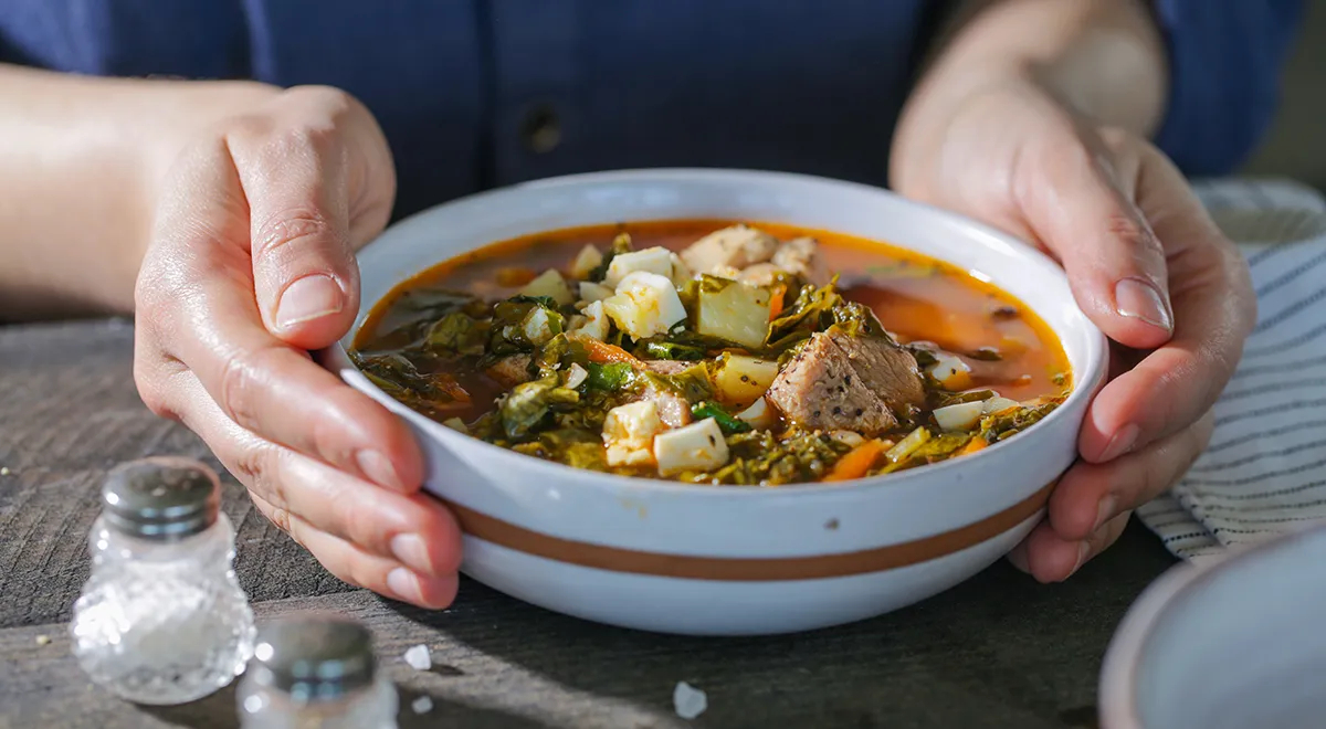 Зеленый борщ со щавелем и свининой