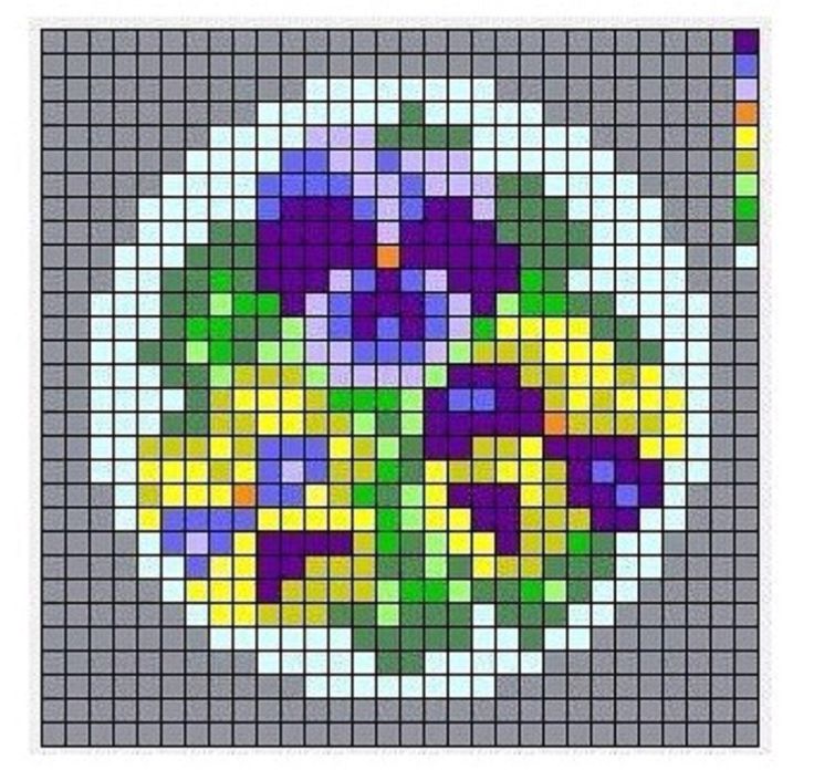 a cross - stitch pattern with flowers in the center on a white plate and gray background