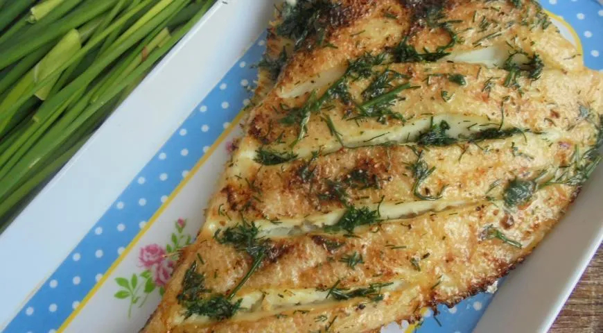 - РЕЦЕПТ ПРИГОТОВЛЕНИЯ Негаснущий экран Нажмите, чтобы экран не гас, пока вы готовите. Экран вернется в привычный режим, когда вы покинете страницу или отключите функцию Шаг 1 Подготовить все ингредиенты блюда. Камбалу вымыть и обсушить бумажными полотенцами.Шаг 2 Отрезать у камбалы голову и плавники. Очистить тушку от внутренностей. Вымыть камбалу еще раз и обсушить. Сделать диагональные надрезы на коже. Натереть солью и перцем, сбрызнуть оливковым маслом.Шаг 3 Духовку разогреть до 220°C. Выложить подготовленную камбалу на противень, выстланный бумагой для выпечки. Поместить на средний уровень духовки. Запекать 5 минут. Сбрызнуть лимонным соком и готовить при той же температуре примерно 25 минут.Шаг 4 Сливочное масло настругать и оставить на 10 минут, чтобы оно стало мягким. Добавить измельченный укроп (можно также использовать петрушку). Тщательно перемешать. Шаг 5 Распределить по горячей запеченной камбале смесь сливочного масла и укропа. Она растает, и рыба станет еще более нежной и ароматной. Сразу же подать камбалу на стол.