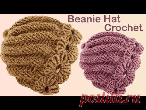 Gorro Fácil tejido en espiral remolino con flores trenzas de abanicos a Crochet