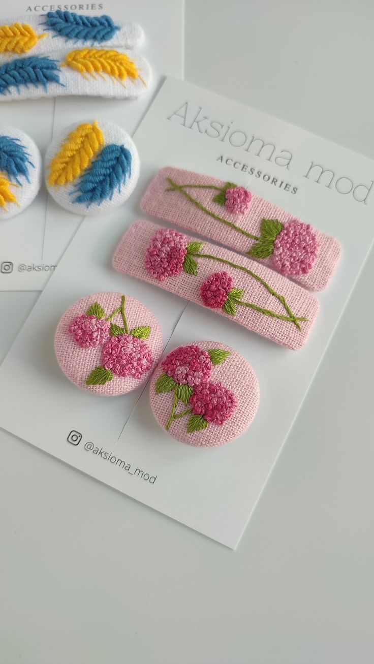 three brooches with flowers on them sitting on top of a card next to each other