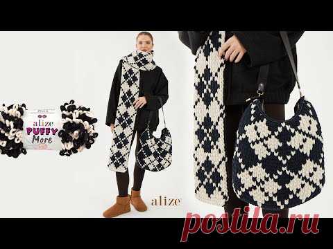 Шарф и сумка с ромбовидным узором с Alize Puffy More