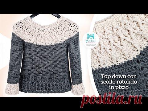 Maglia top down con scollo rotondo in pizzo. Semplice e di grande effetto.